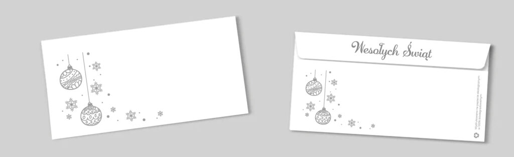 Wybierz koperty z nadrukiem lub czyste. Zaznacz w formularzu wybraną opcję. Jako jedyni w Polsce oferujemy do wyboru koperty czyste lub koperty z oryginalnym srebrnym nadrukiem świątecznym GRATIS! Koperta z nadrukiem dwustronnym wyróżni Twoją kartkę świąteczną i doda jej prestiżu. Nadruk na kopercie uwzględnia miejsce na wklejenie znaczka, wpisanie adresu i ewentualnie pieczątkę firmową.