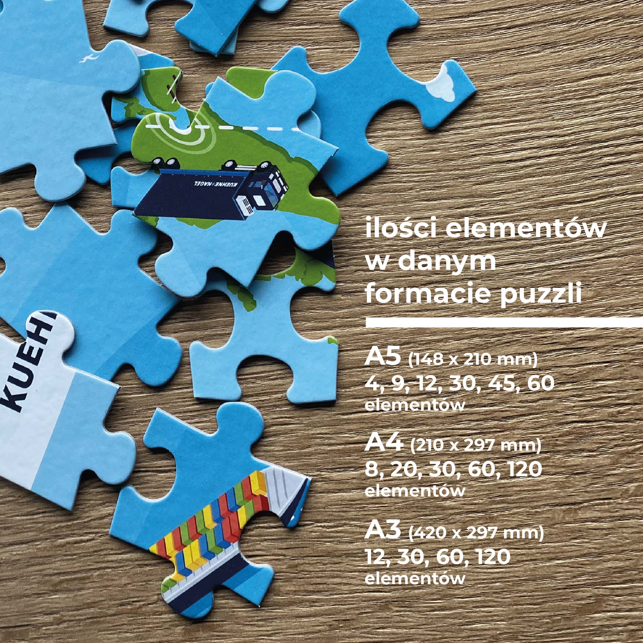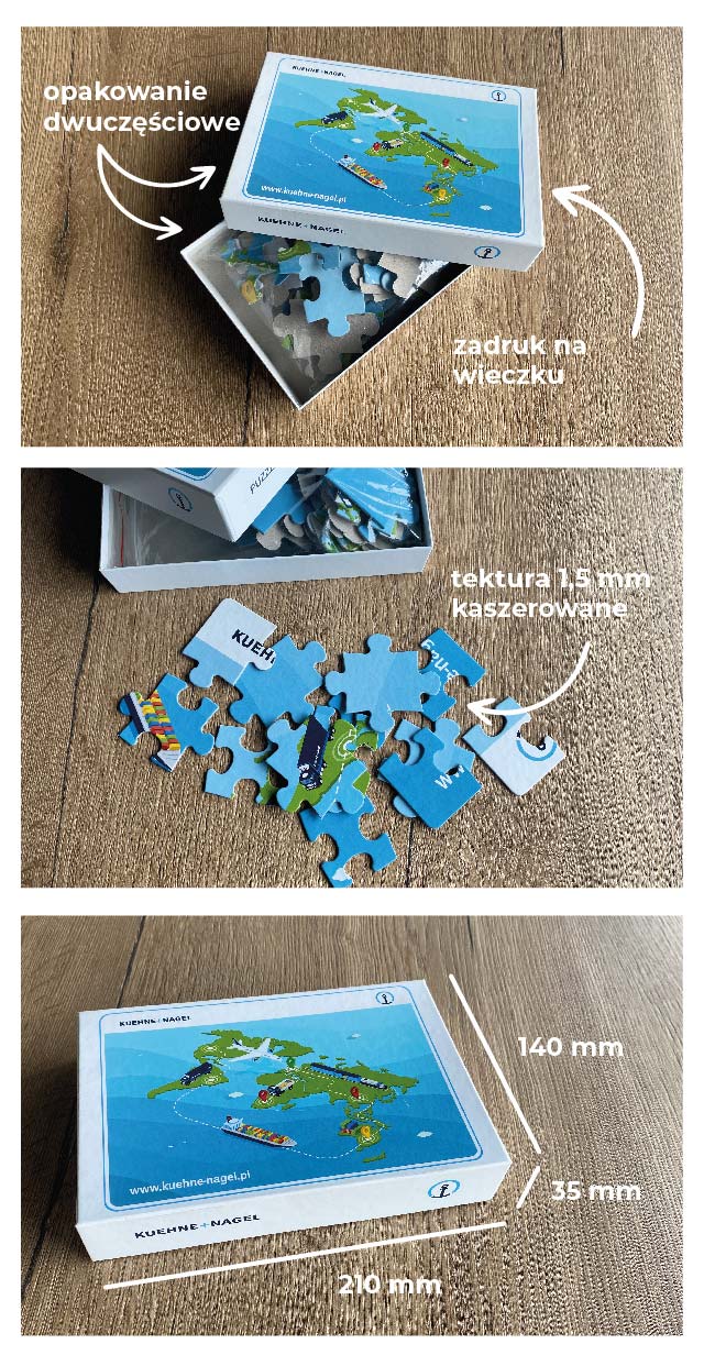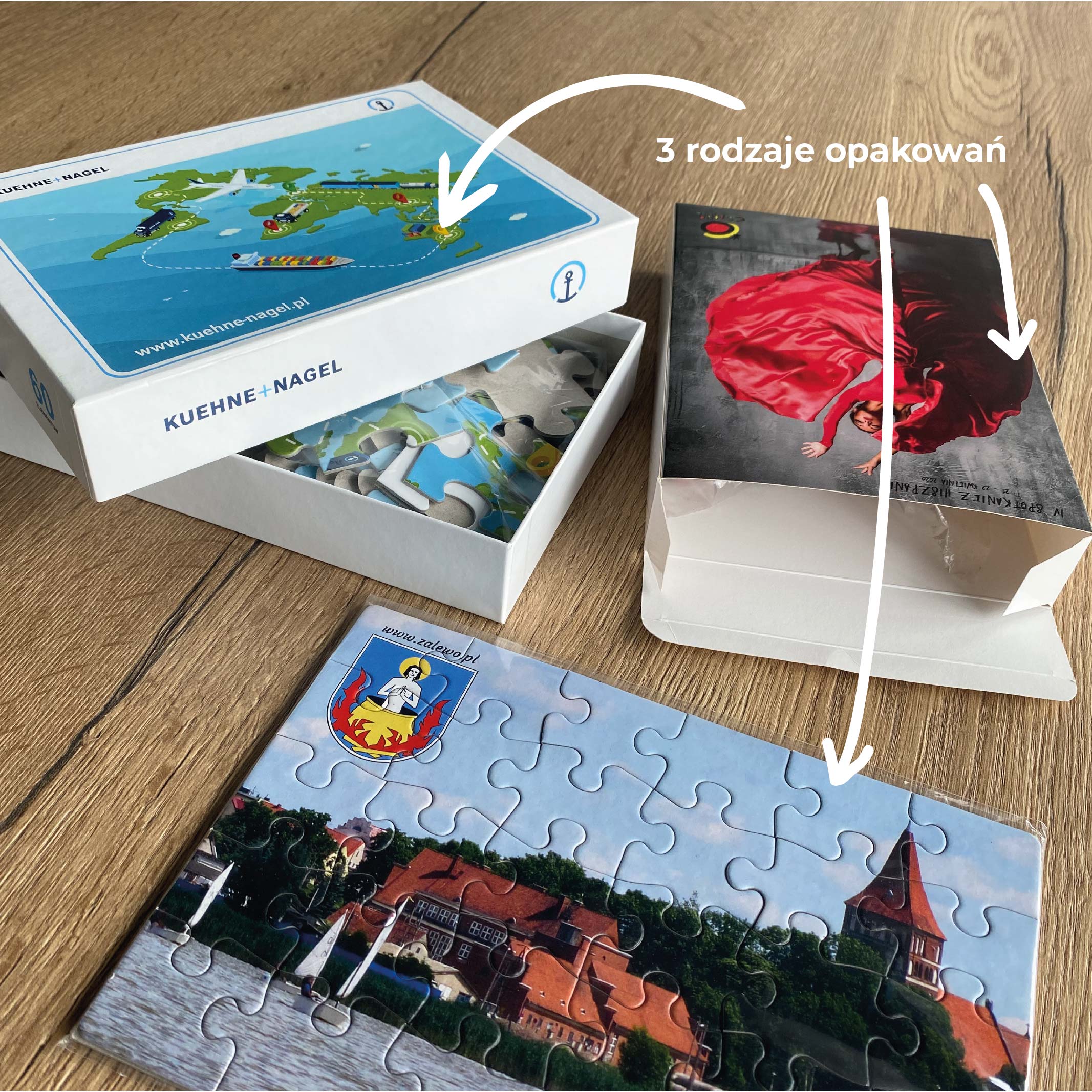 Puzzle reklamowe w opakowaniu dwuczęściowym, karton 300g + folia błysk lub mat, nadruk 4/0 (jednostronny druk kolorowy)