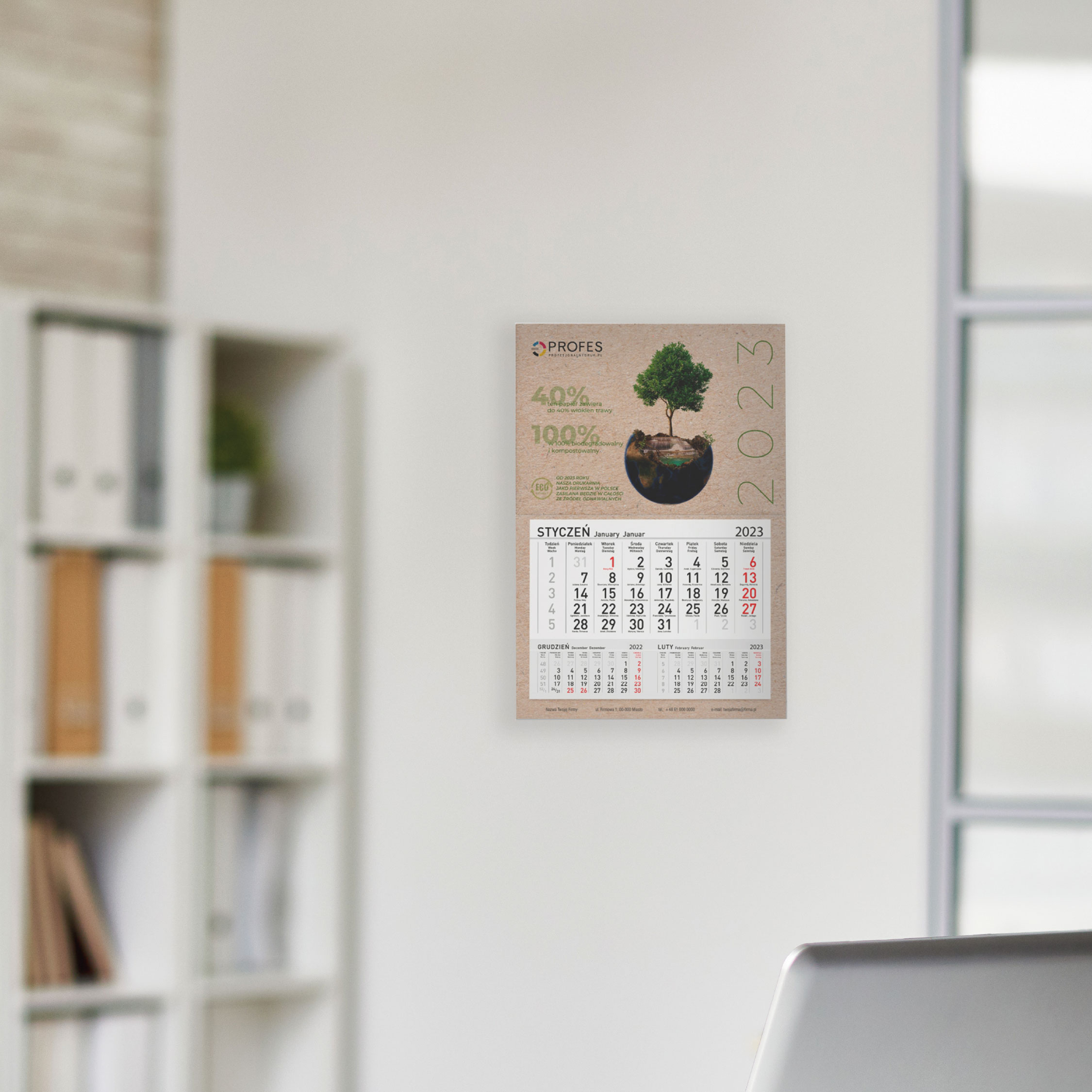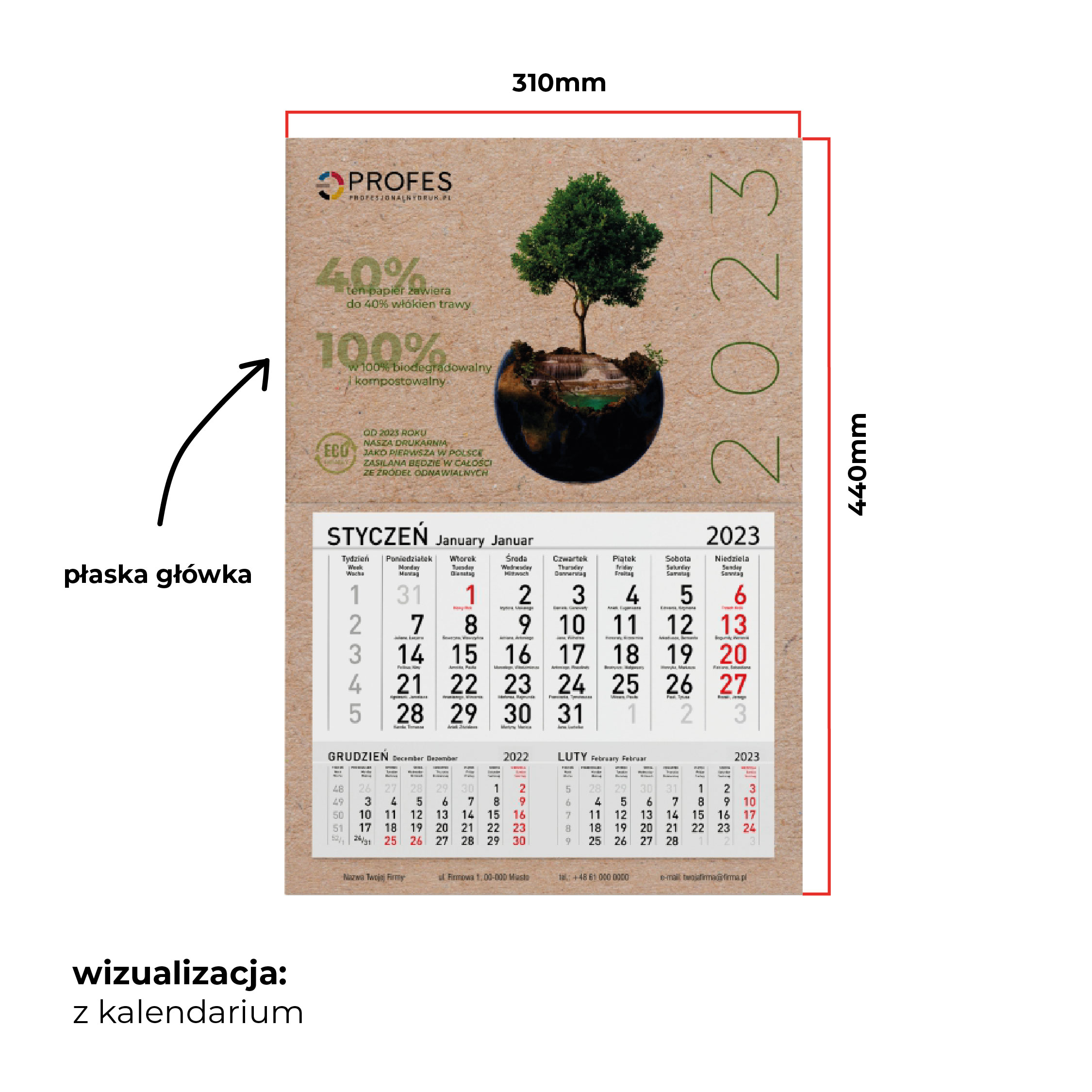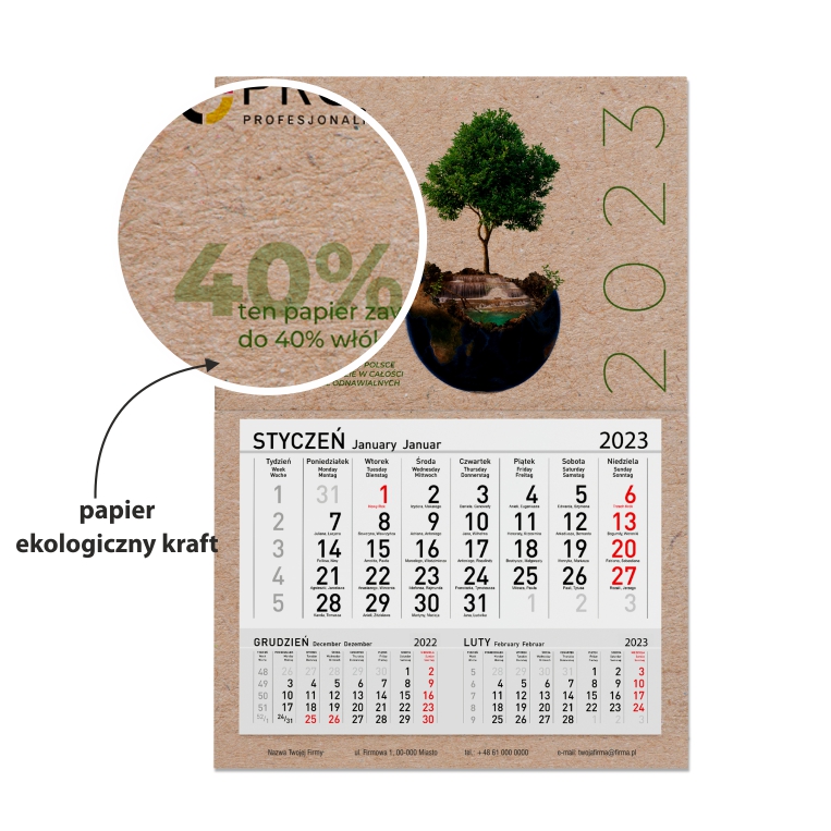 EKOLOGICZNY kalendarz jednodzielny z indywidualną grafiką reklamową.