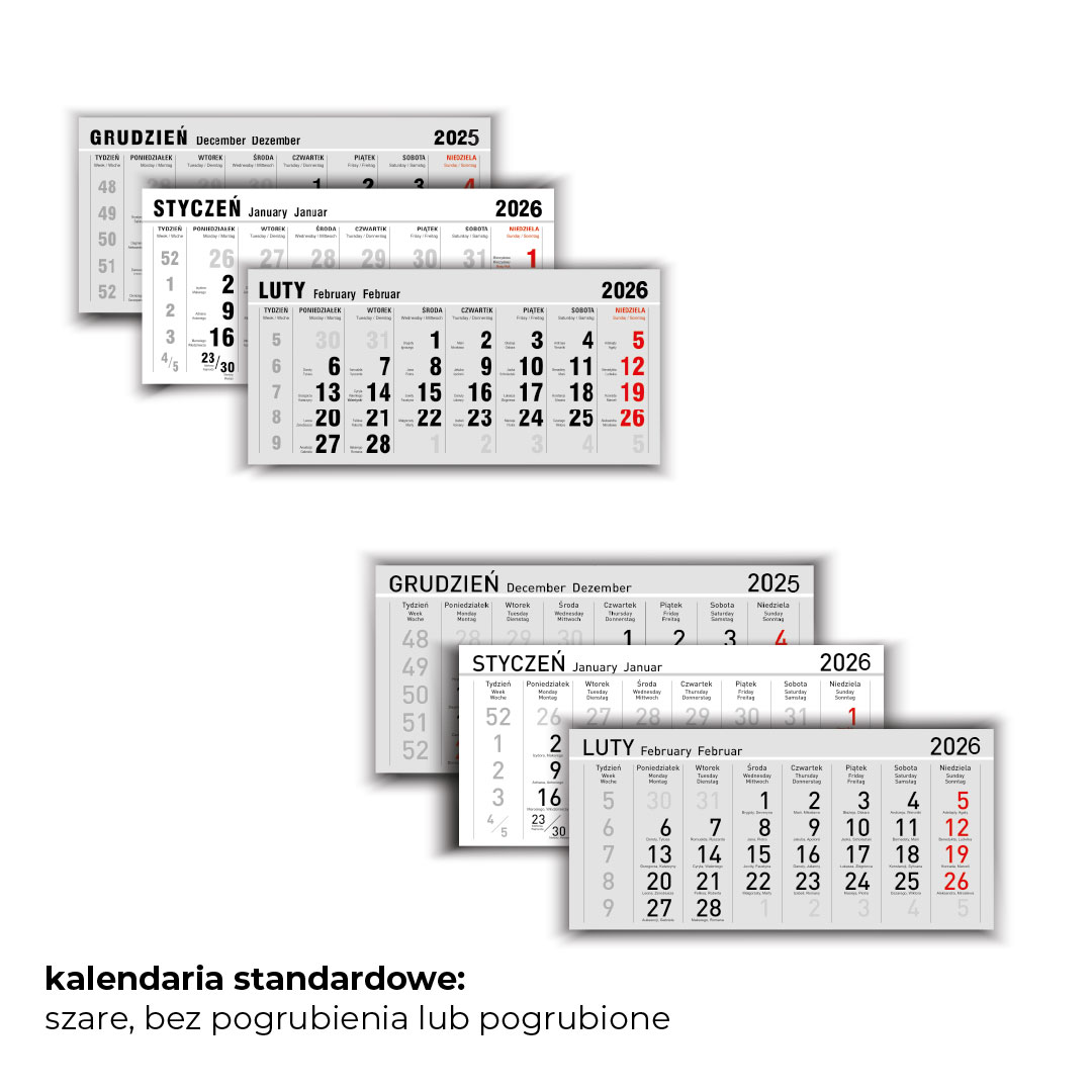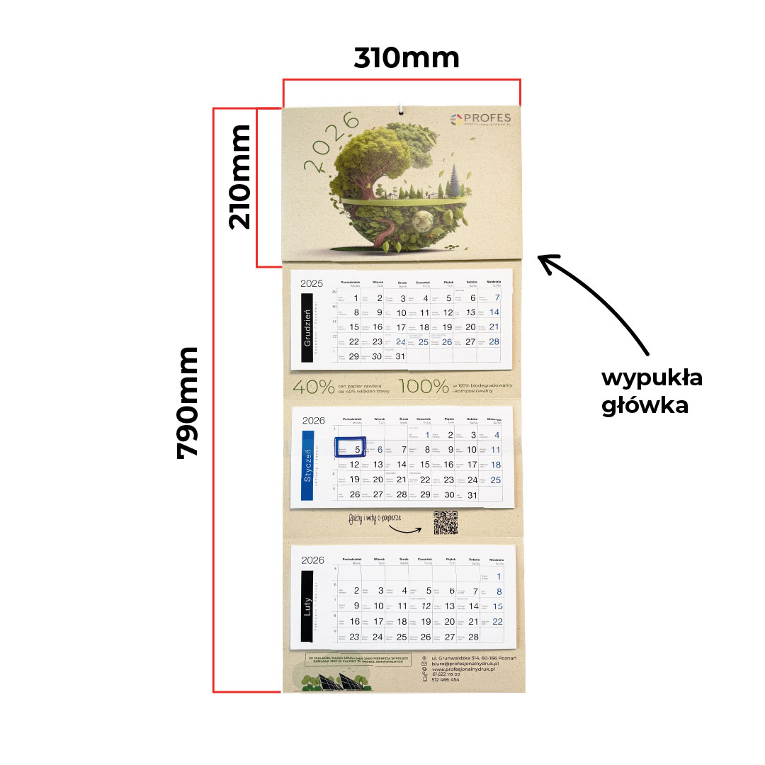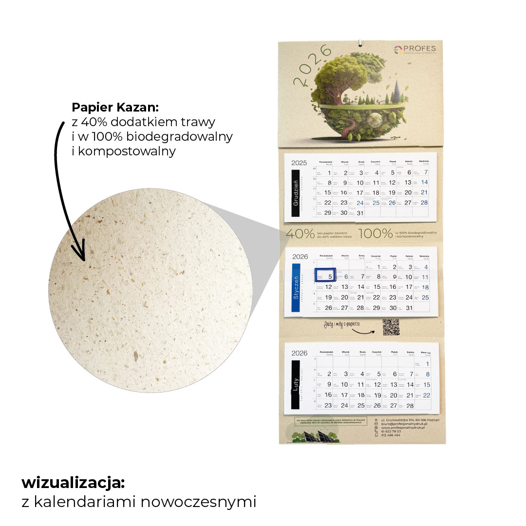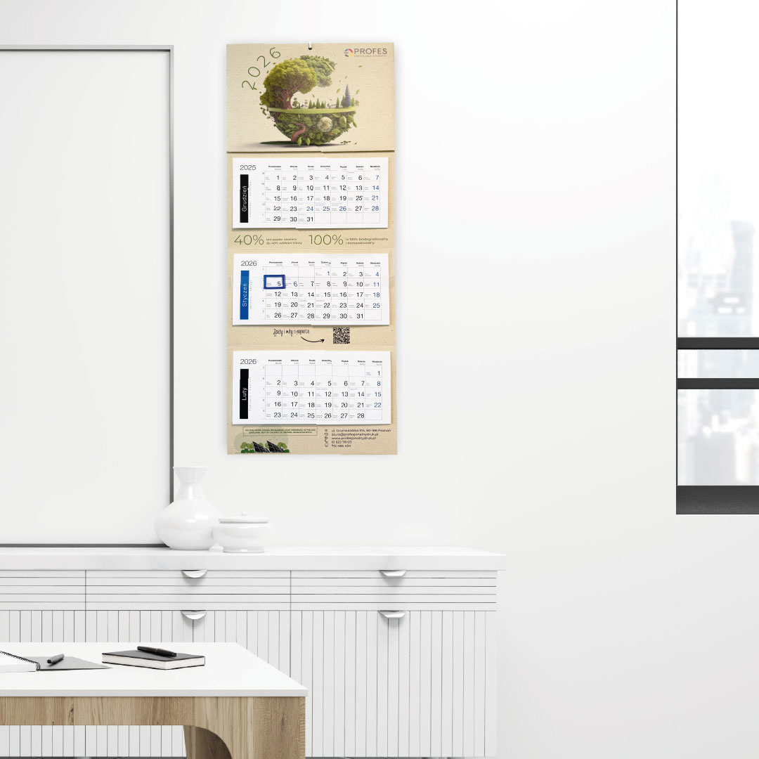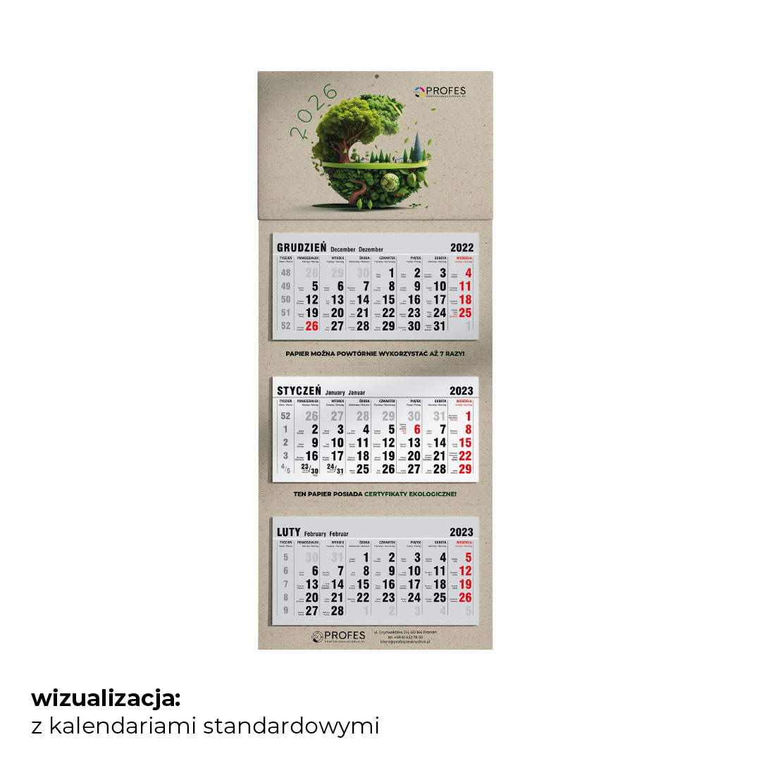 EKOLOGICZNY kalendarz trójdzielny z indywidualną grafiką reklamową zarówno na wypukłej główce jak i plecach.