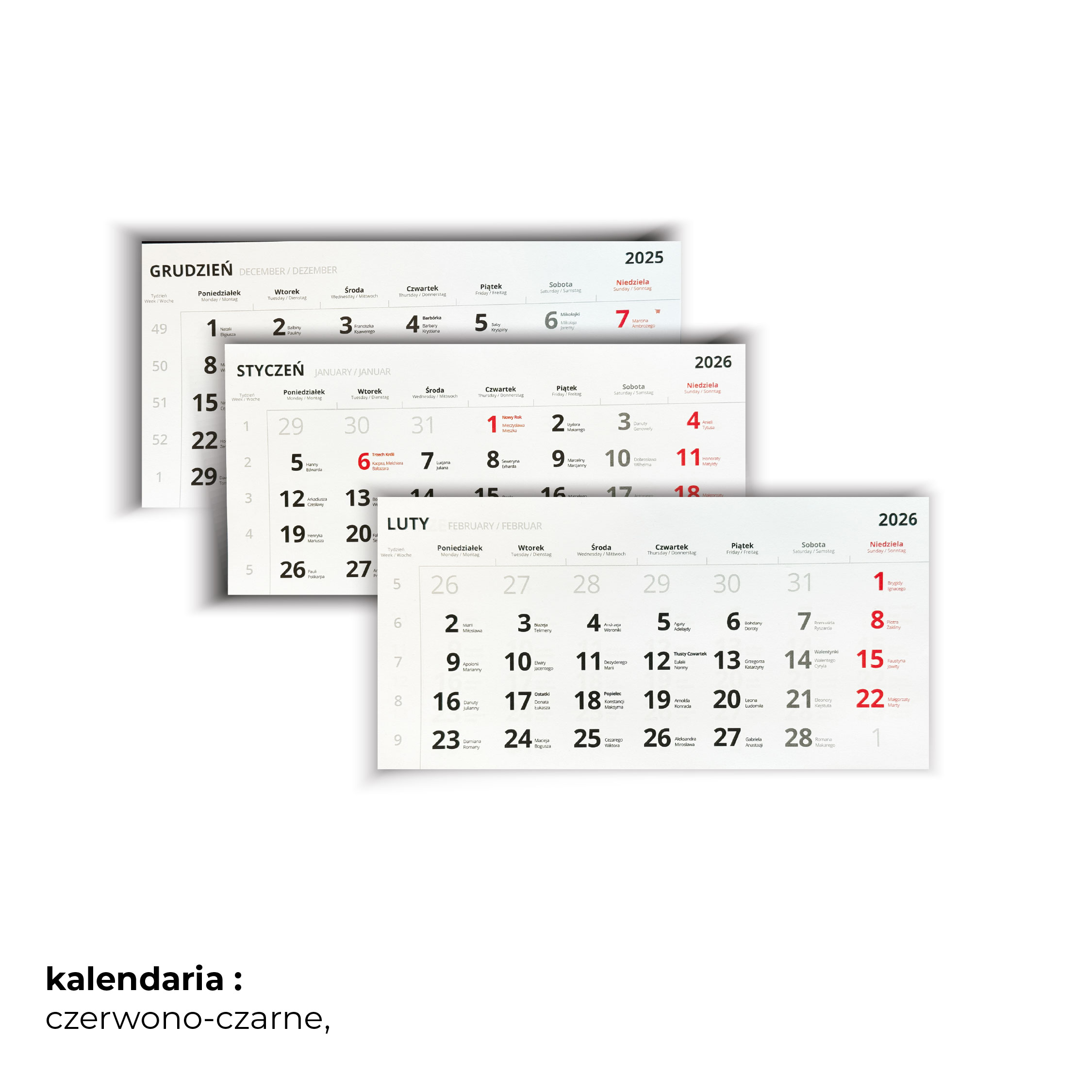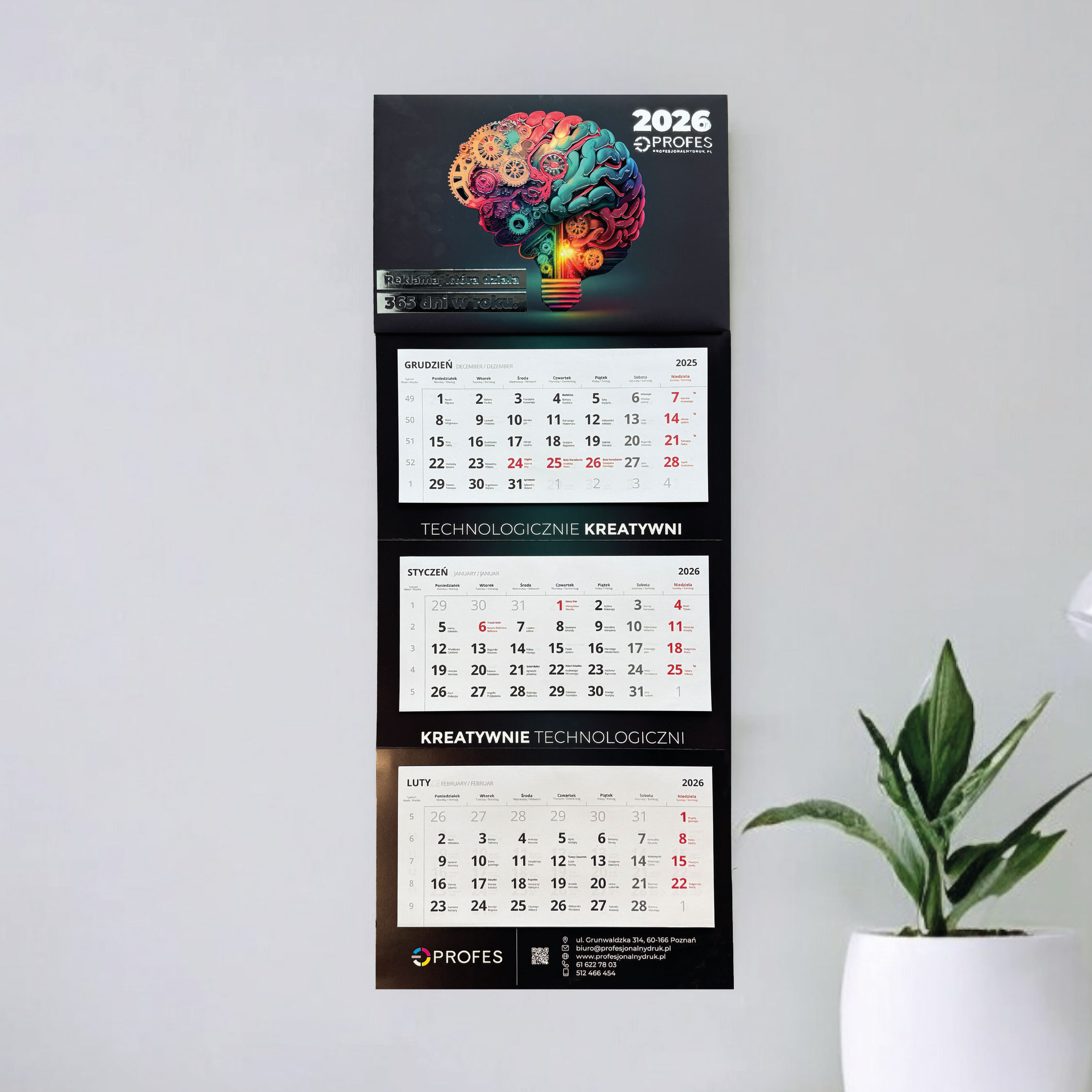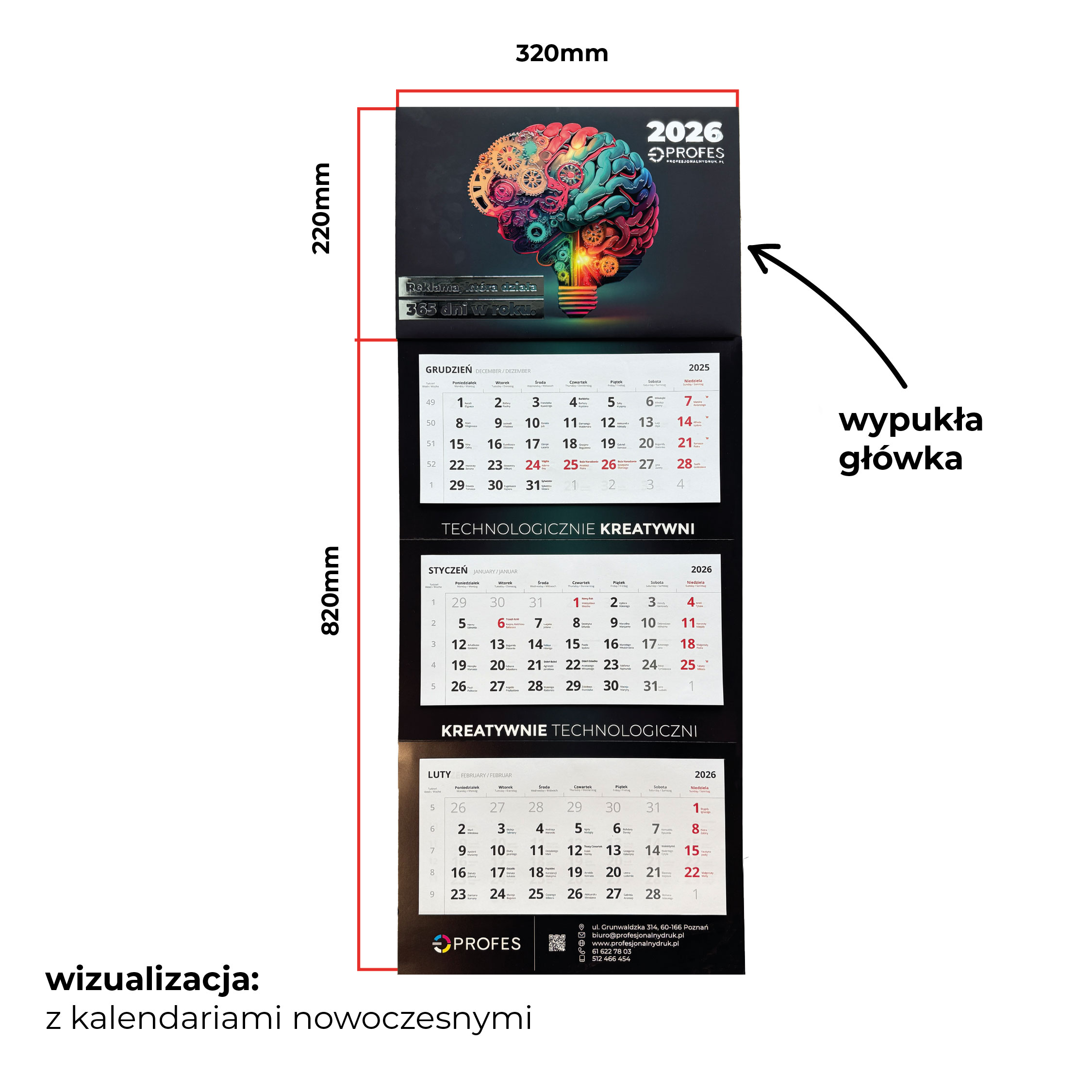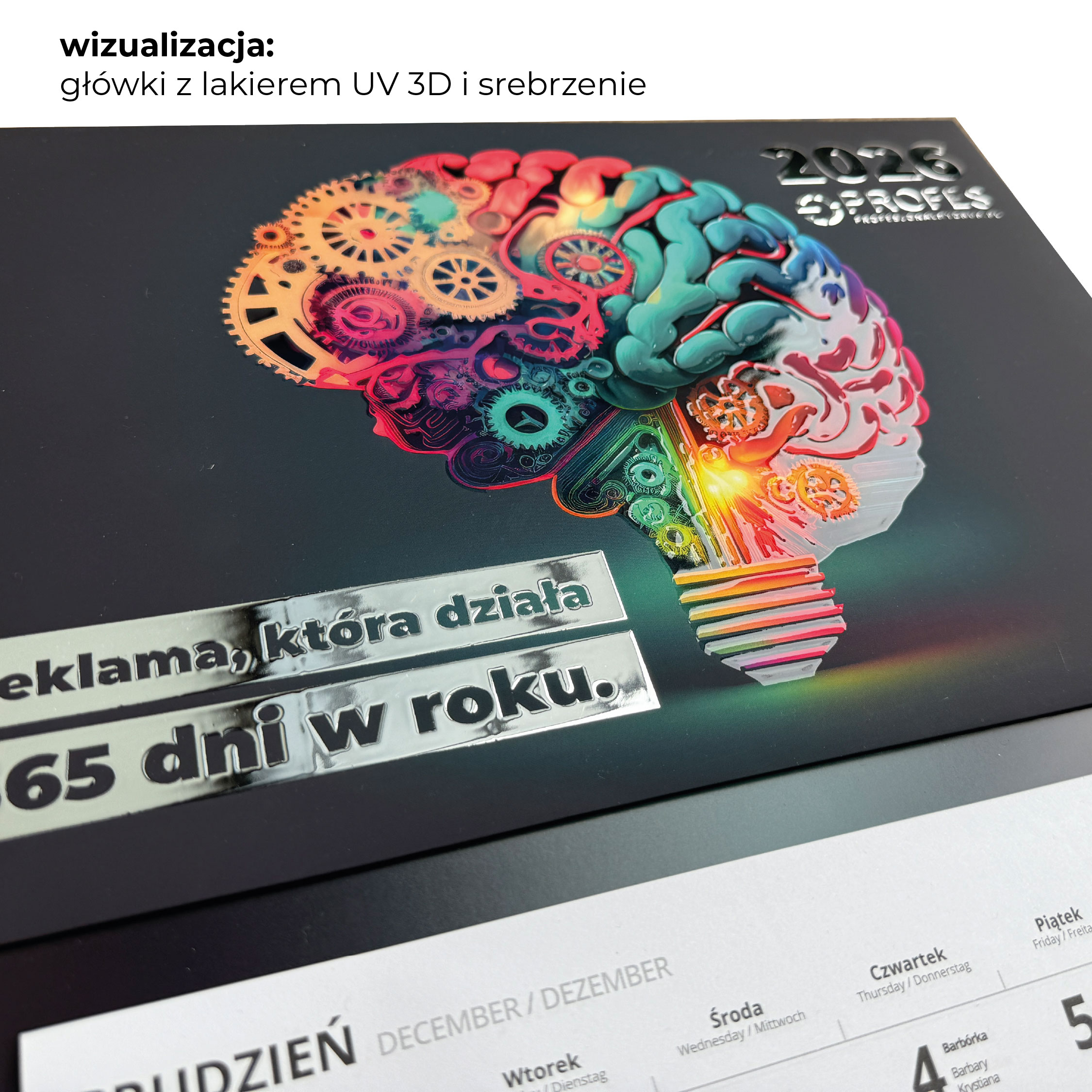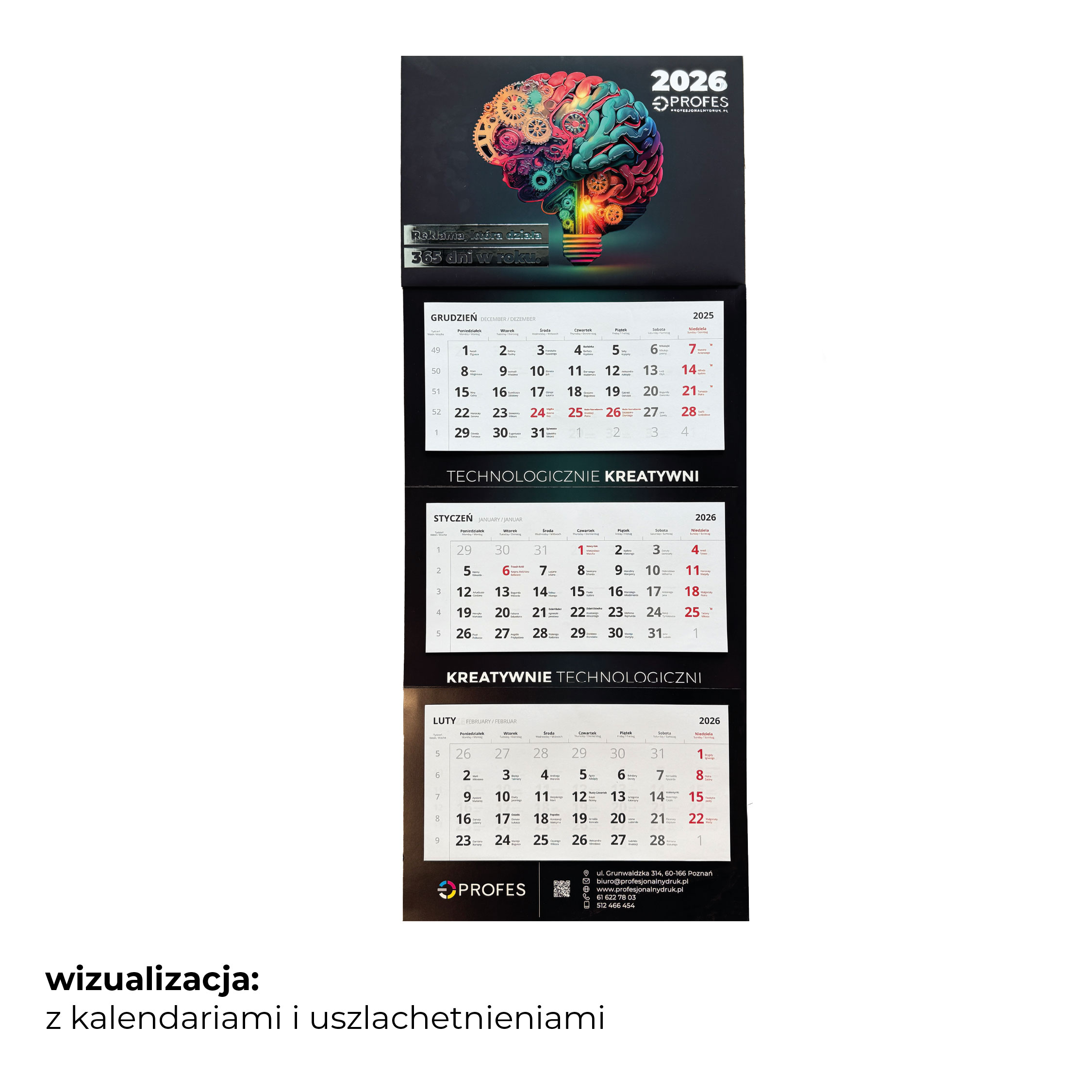 kalendarz trójdzielny premium z uszlachetnieniem na główce i indywidualną grafiką reklamową zarówno na główce jak i plecach.