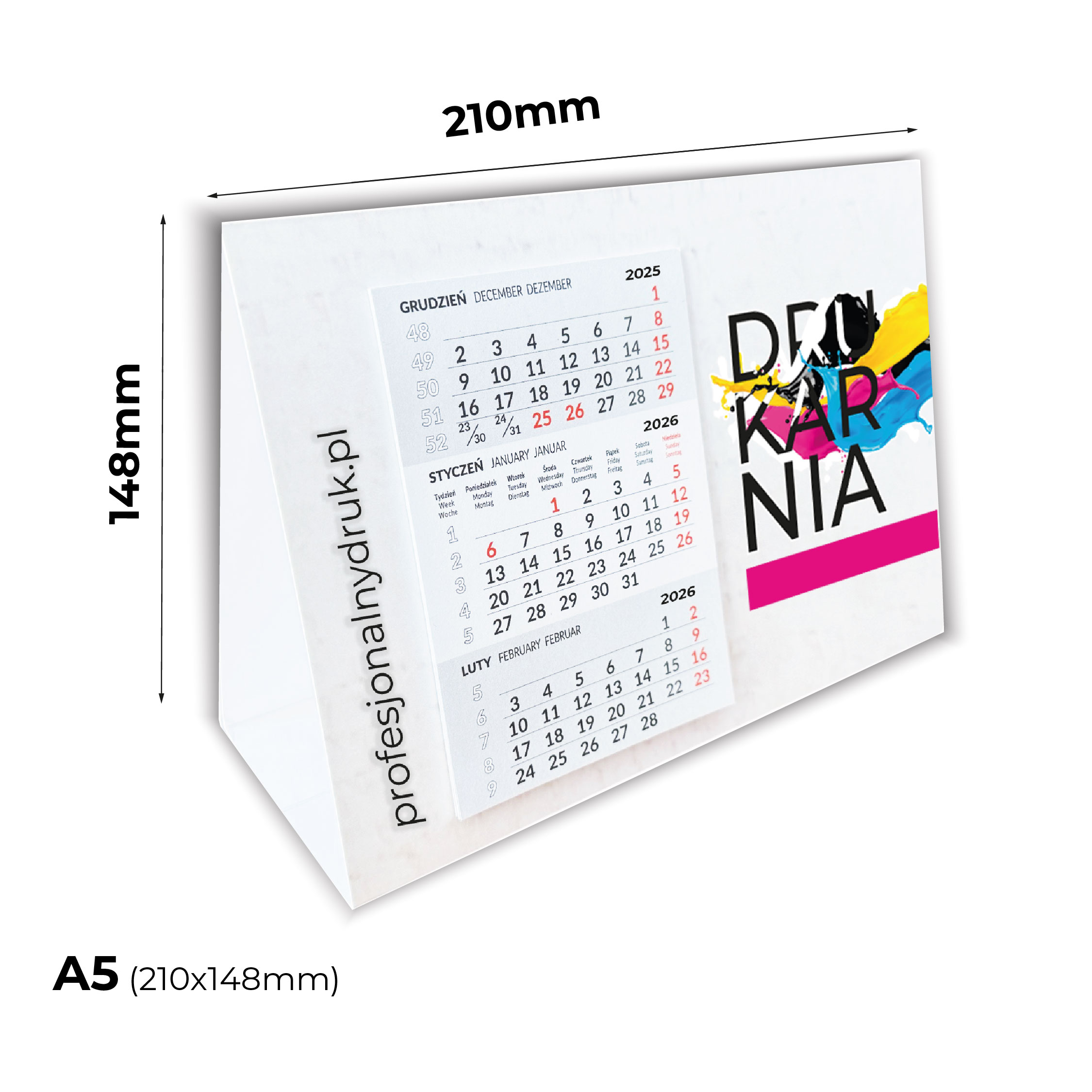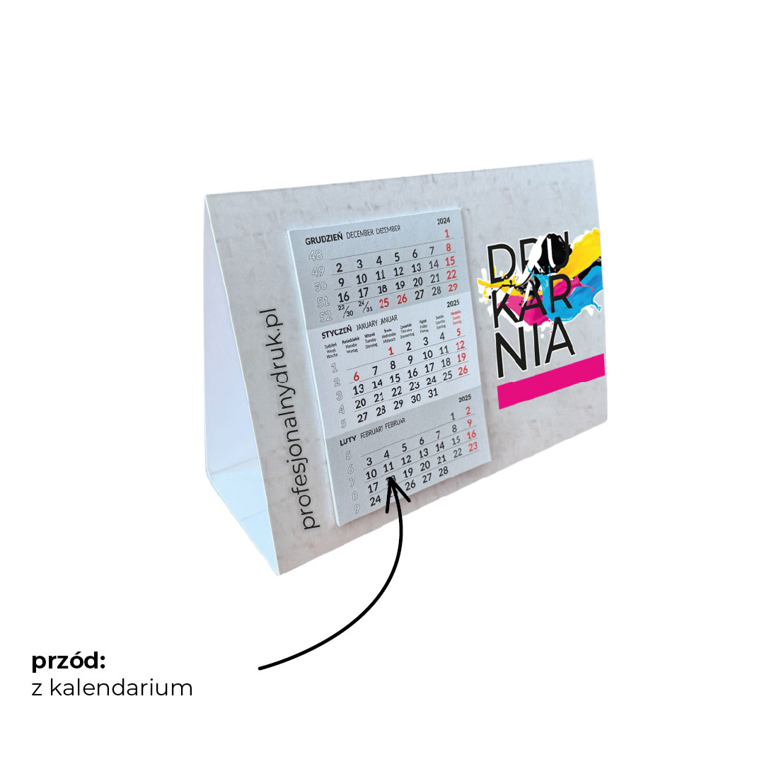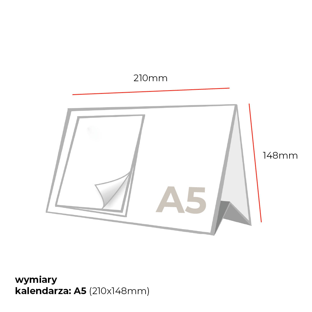 Format: A5 210 mm x 148 mm; Kalendarium: gotowe 85 mm x 120 mm, wklejanie, piramidka kartonowa z Twoim kolorowym nadrukiem