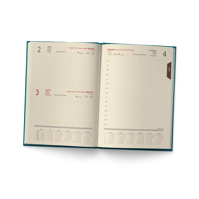 Układ: 1 dzień na jedną stronę, sobota i niedziela na 1 stronie, przed każdym miesiącem terminarz miesięczny,
