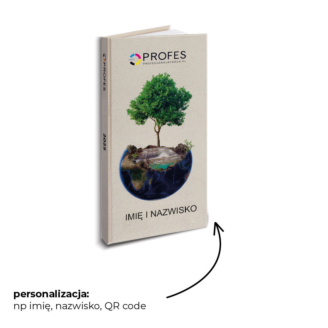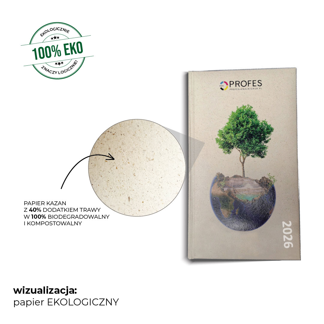 Jako prawdopodobnie jedyni w Polsce wykonujemy kalendarz książkowy z tego typu okładką. Okładka drukowana jest na nietypowym papierze z 40% dodatkiem trawy, który posiada certyfikat kompostowalności oraz FSC. Papier okładki jest unikalny w dotyku, posiada ciekawą strukturę, delikatnie szorstki w dotyku z nietypową barwą.