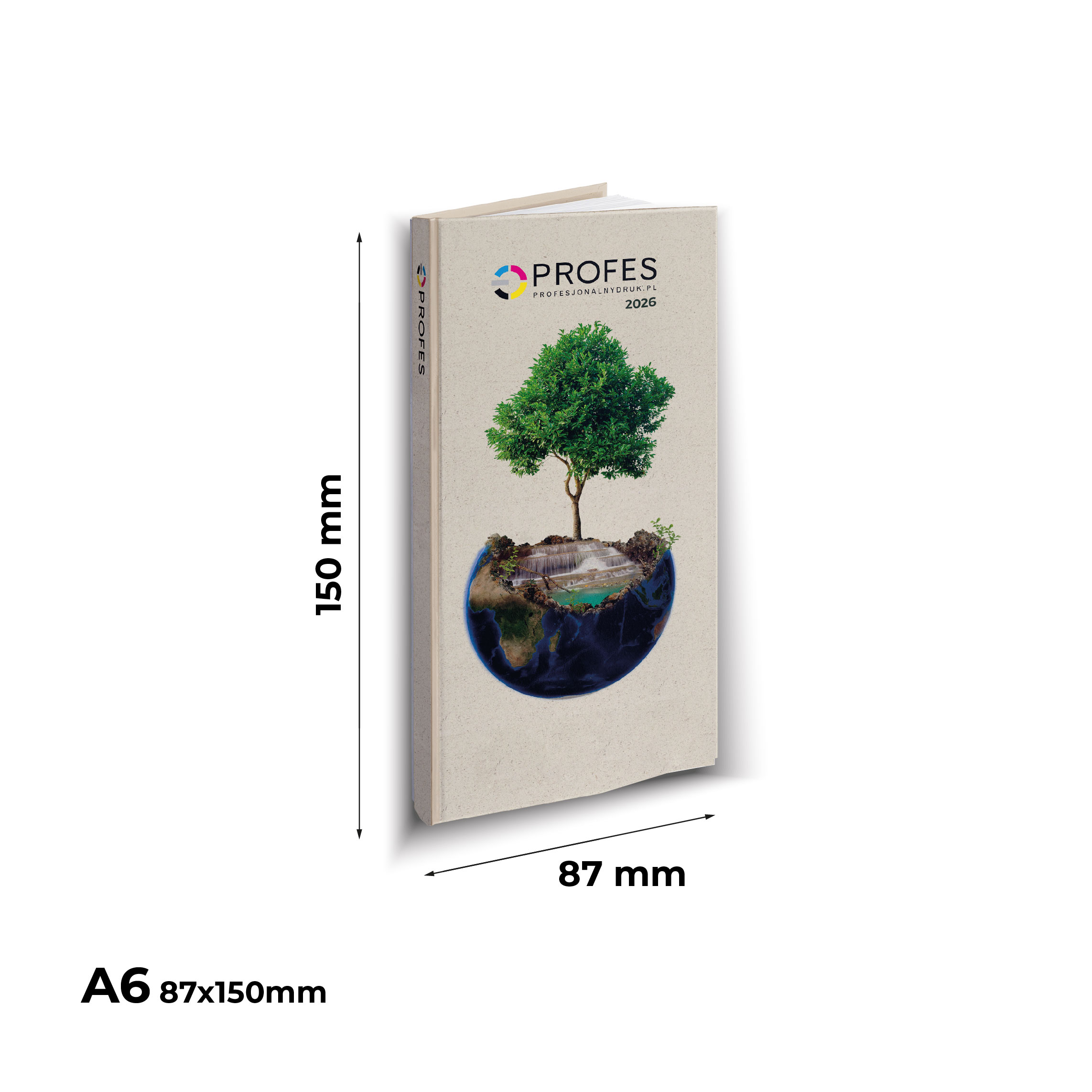 Okładka: Wykonana ze sztywnej tektury, z gąbką z przodu i oklejona oklejona wydrukiem z logo i projektem klienta na papierze z 40% zawartością włókien trawy