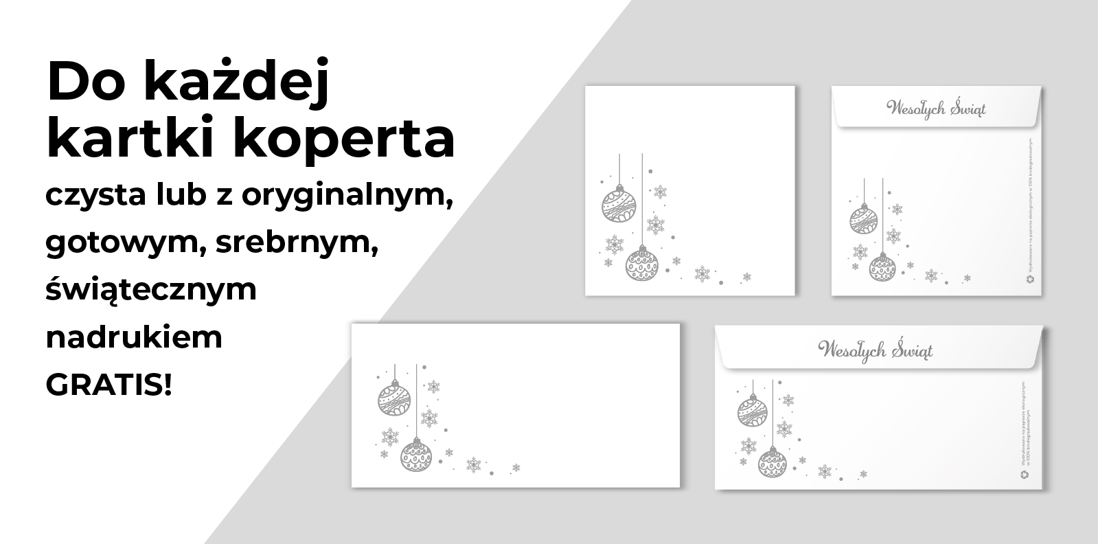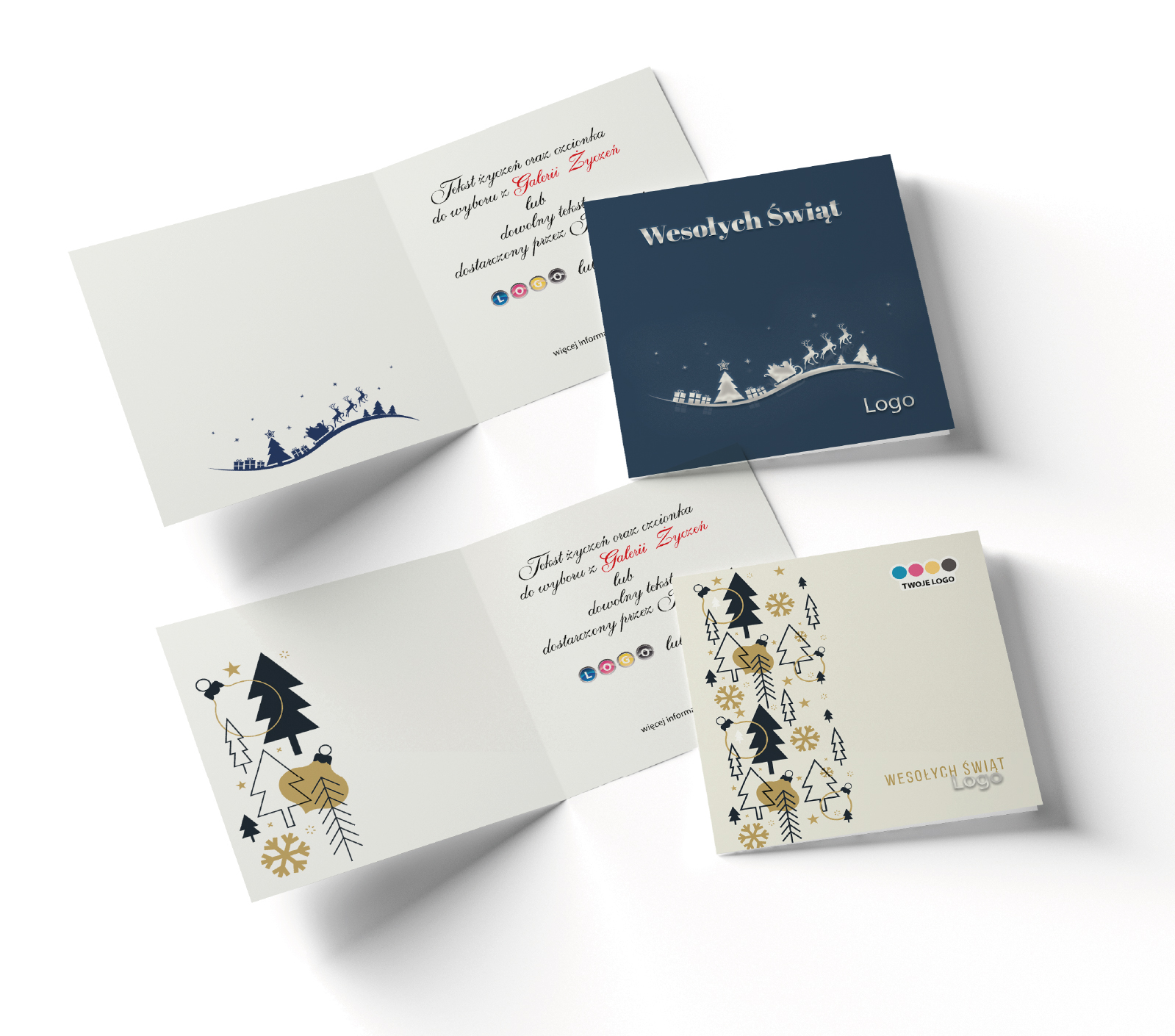 Eleganckie kartki świąteczne idealne jako świąteczne życzenia dla klientów, partnerów biznesowych i bliskich. Dostępne w dwóch formatach: DL (otwierane po długim boku) oraz kwadrat 150×150 mm. Pokrycie folią soft touch – aksamitny efekt w dotyku. Uszlachetnione lakierem UV 3D + złoceniem lub srebrzeniem. Możliwość umieszczenia logo na każdej stronie i własnych życzeń. W komplecie koperty: białe gładkie lub z eleganckim srebrnym nadrukiem. Na praktycznie każdej kartce z naszej galerii możemy położyć lakier UV 3D ze złoceniem lub srebrzeniem.
