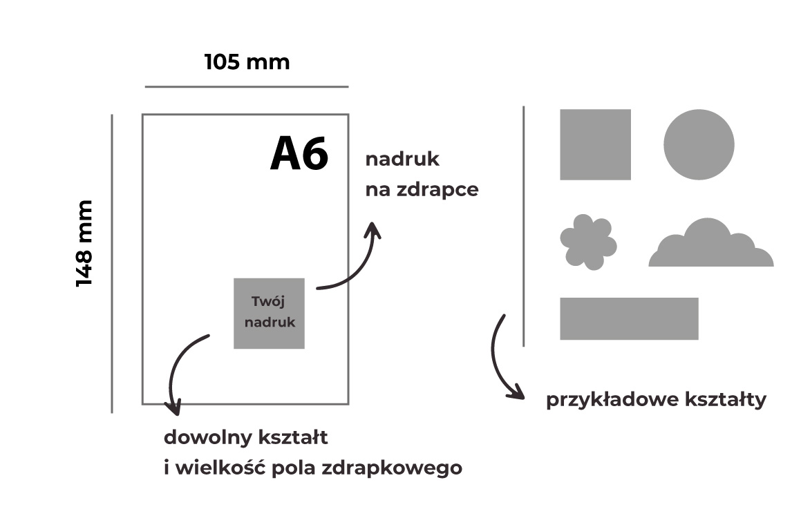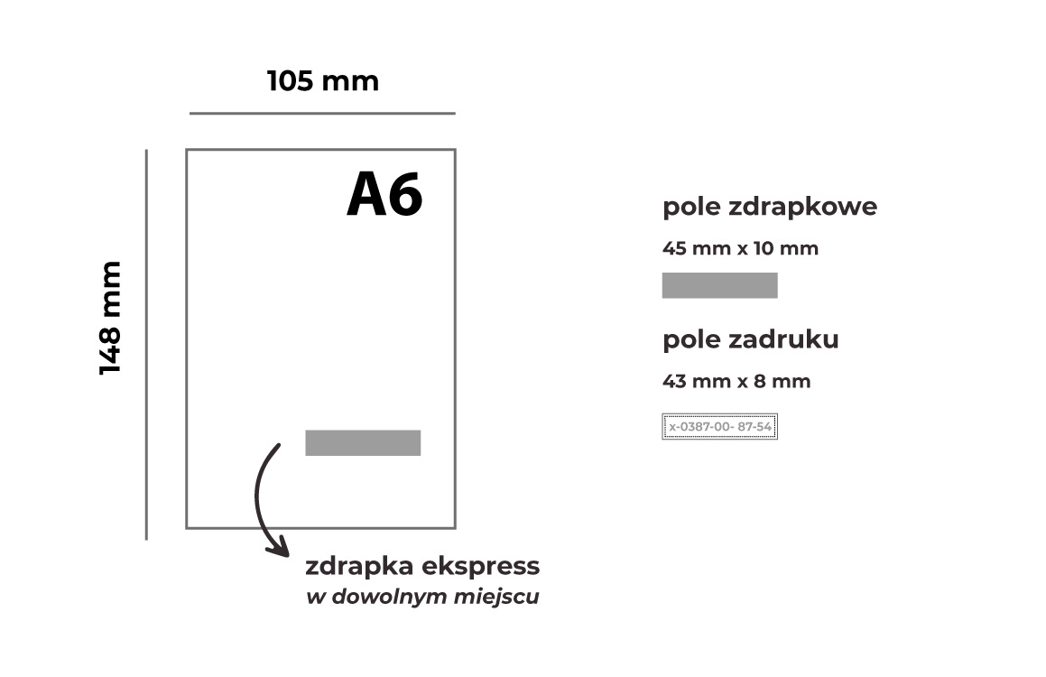 KUPON A6 148×105 mm ZE ZDRAPKĄ o dowolnym kształcie i wielkości pola zdrapkowego