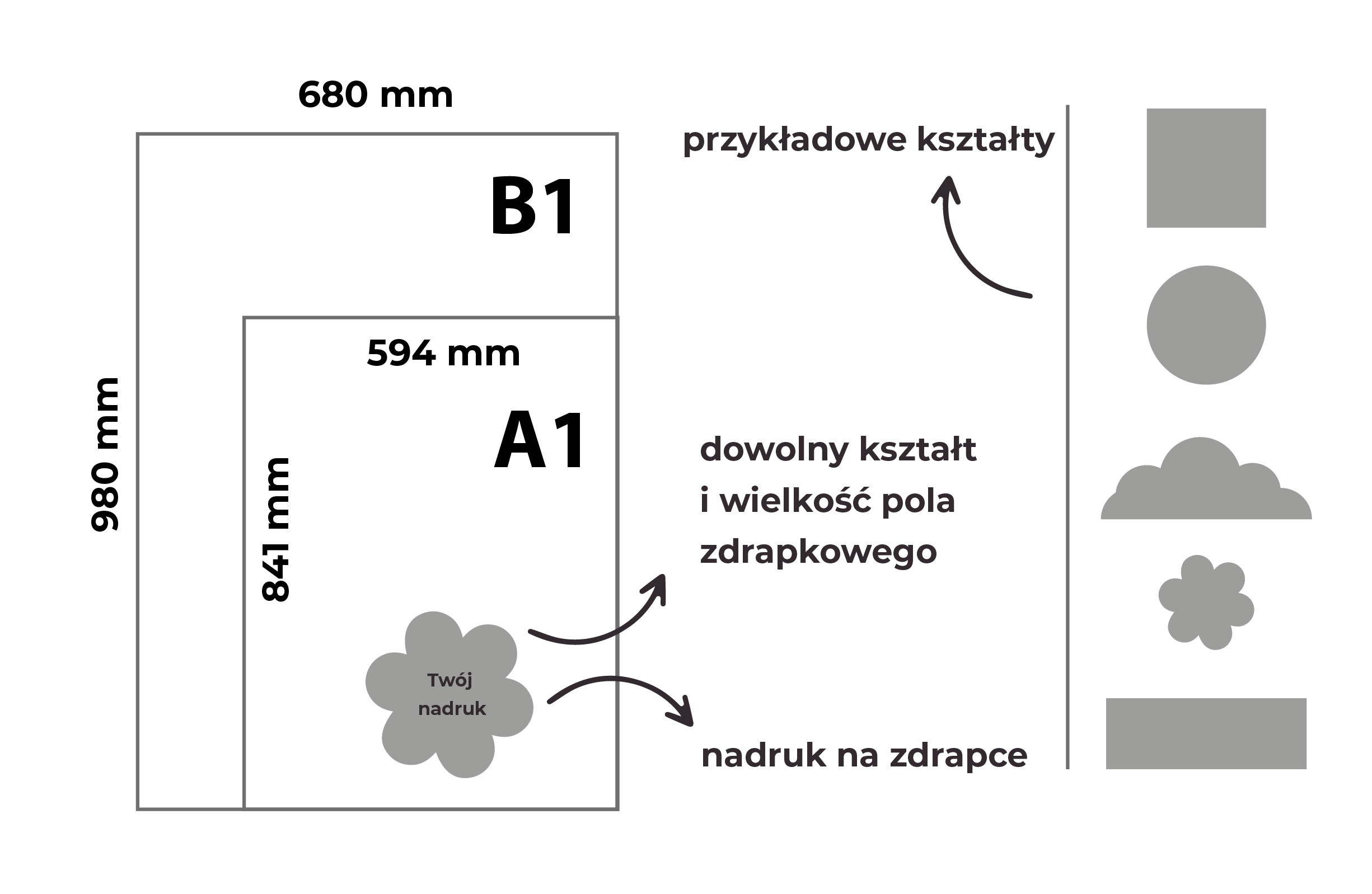 PLAKAT  B1 680×980mm, A1 594×841mm ZE ZDRAPKĄ o dowolnym kształcie i wielkości pola zdrapkowego